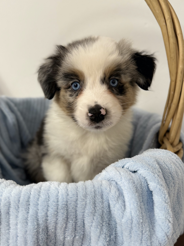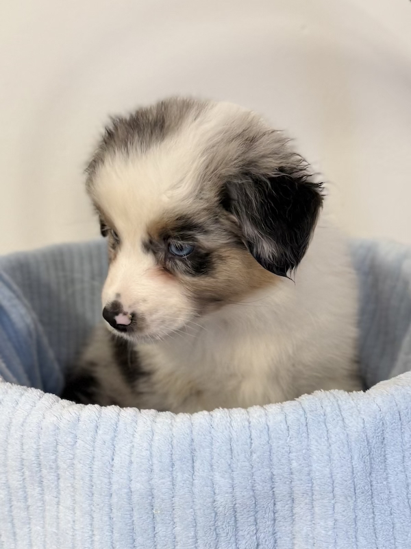 Rieshof Moonstone Spirit trägt ein helles, lebhaft gezeichnetes Blue-Merle-Fell und zwei klare blaue Augen, die dem kleinen Rüden etwas Zartes verleihen. Ganz behutsam sammelt er seine ersten Eindrücke und entwickelt sich im sicheren Rhythmus des Wurfes.