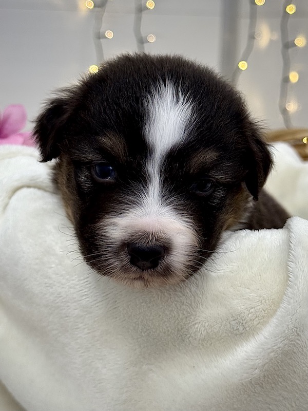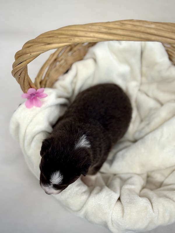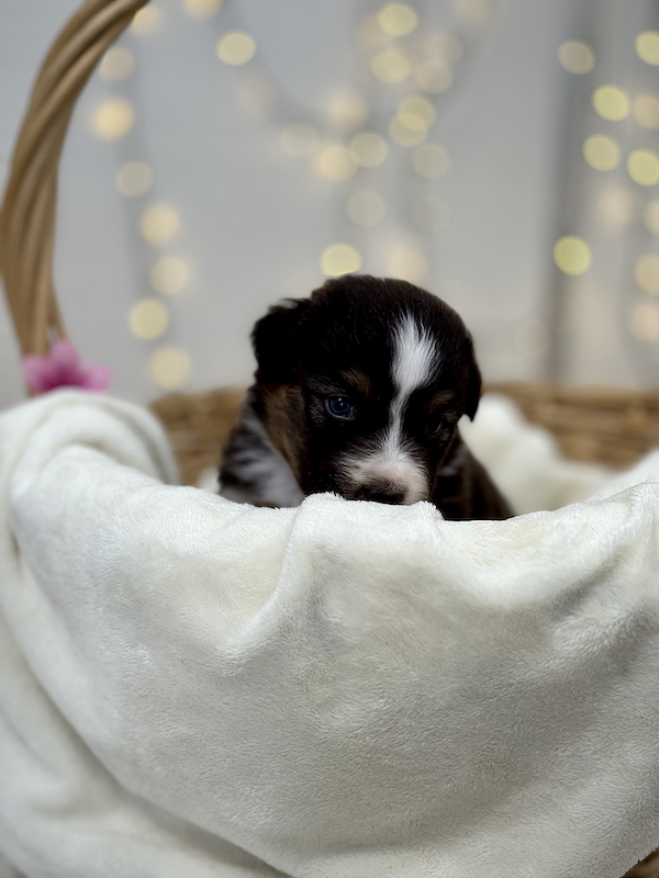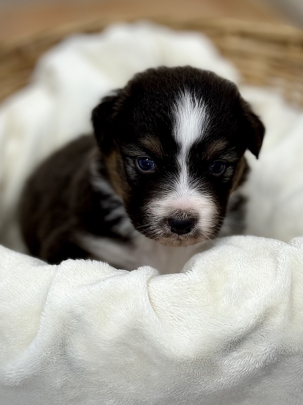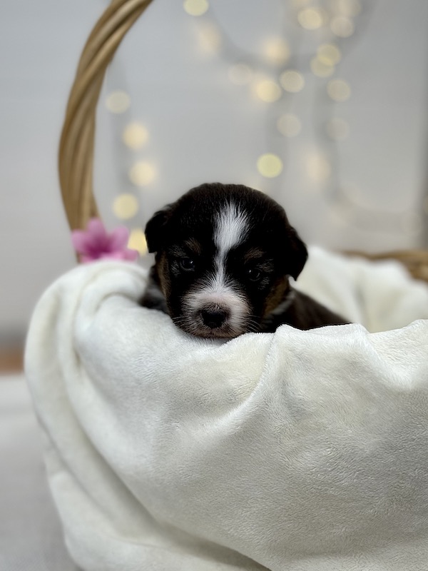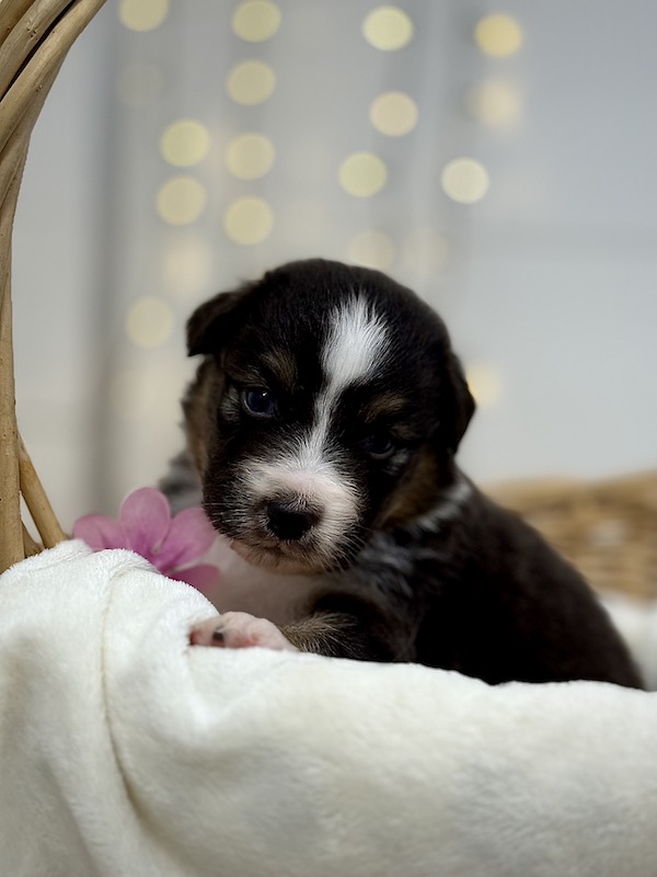 Si tratta di una cucciola femmina di Australian Shepherd nel classico mantello Black Tricolor con Natural Bobtail (NBT). Sarà pronta a trasferirsi nella sua nuova casa all’inizio di novembre.