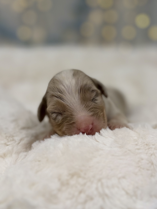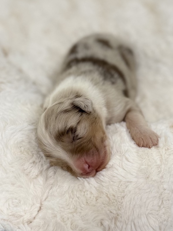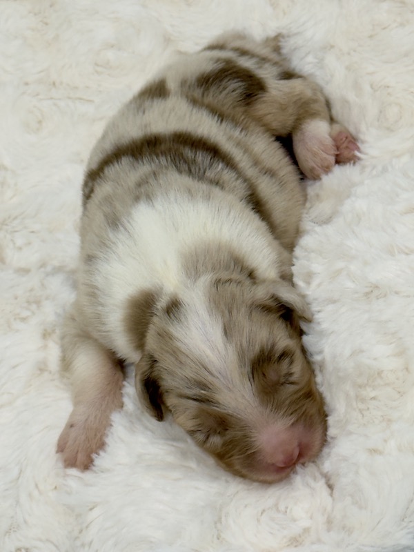 Si tratta di un cucciolo maschio di Australian Shepherd nel bellissimo colore Red Merle con Natural Bobtail (NBT). Sarà pronto a trasferirsi a fine novembre.
