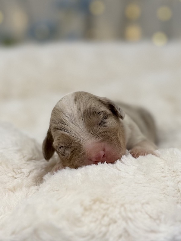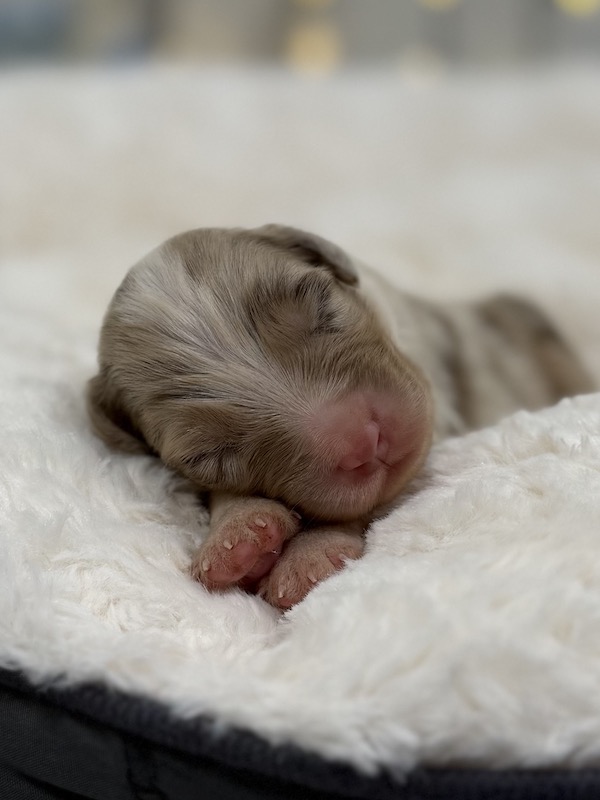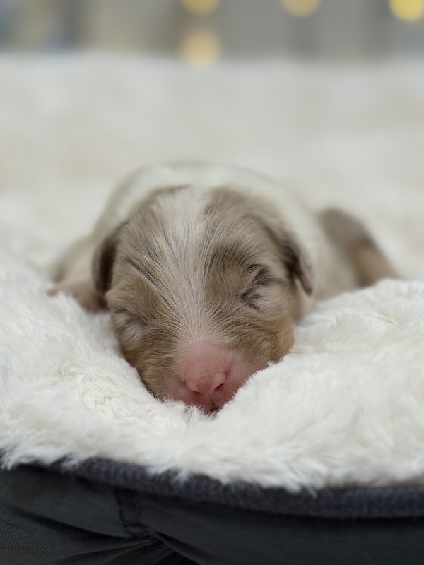 Un cucciolo Red Merle dal fascino speciale – il suo Natural Bobtail (NBT) e il mantello elegante lo rendono già adesso unico.