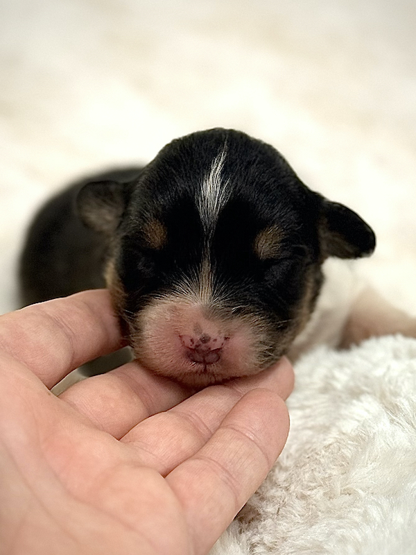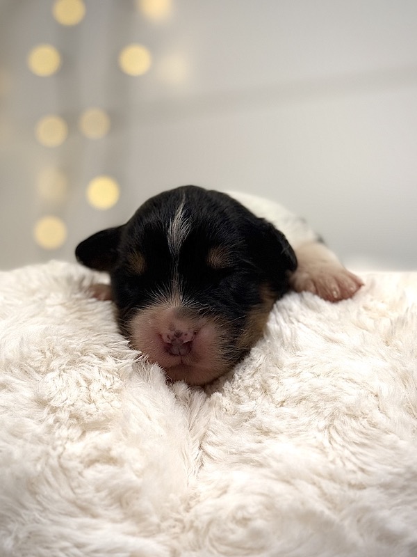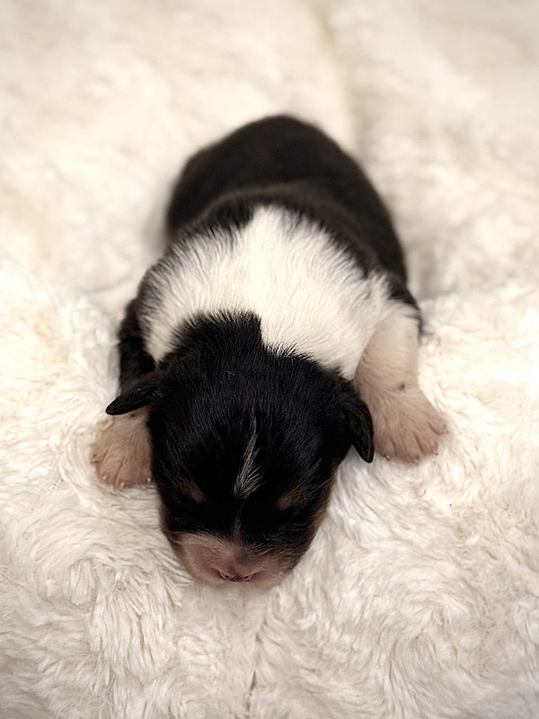 Si tratta di una cucciola femmina di Australian Shepherd nel colore classico Black Tricolor con Natural Bobtail (NBT). Sarà pronta a trasferirsi a fine novembre.