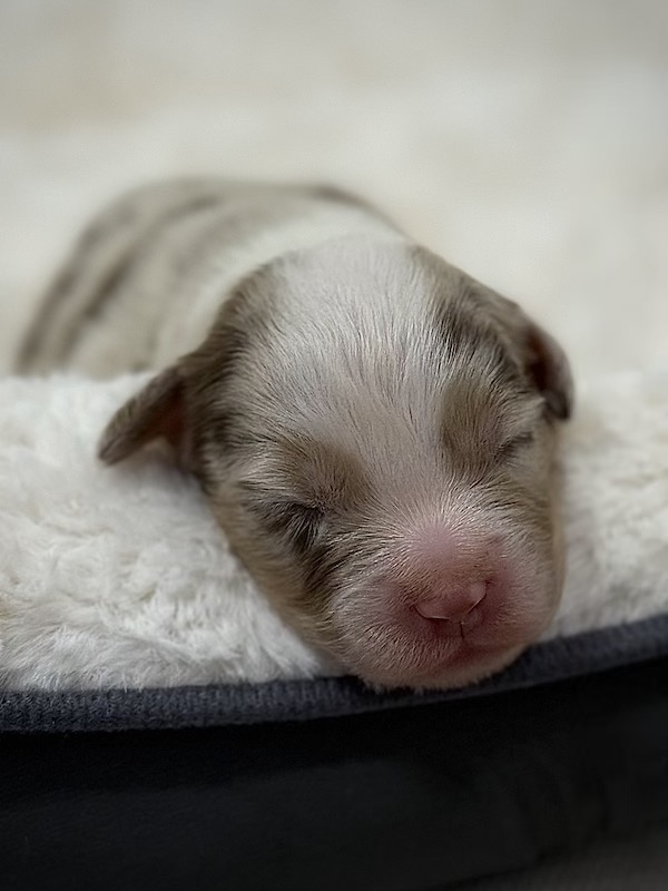 Un piccolo tesoro nel suo splendido mantello Red Merle – già adesso promette tutto ciò che rende speciale l’Australian Shepherd: vivacità, intelligenza e un animo leale.