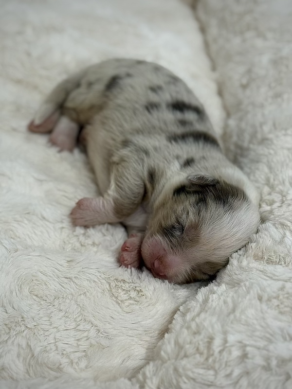 La sua genealogia parla da sé: il padre è Swen, un magnifico maschio Red Merle con un carattere eccellente, la madre Cheri è un’elegante femmina Black Tricolor dal grande fascino. Entrambi i genitori sono stati sottoposti a controlli completi, risultati esenti da malattie genetiche e da displasia dell’anca e del gomito, e si distinguono per la loro indole equilibrata e amichevole.