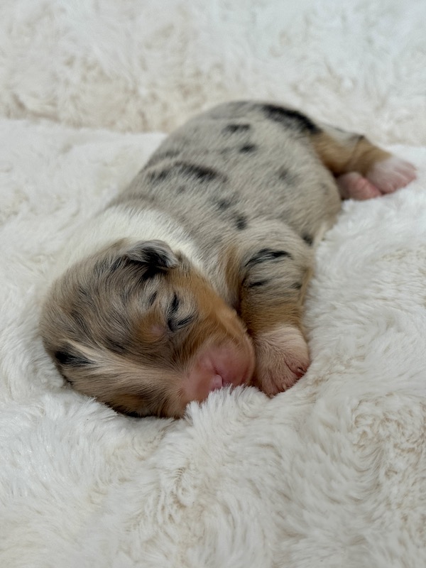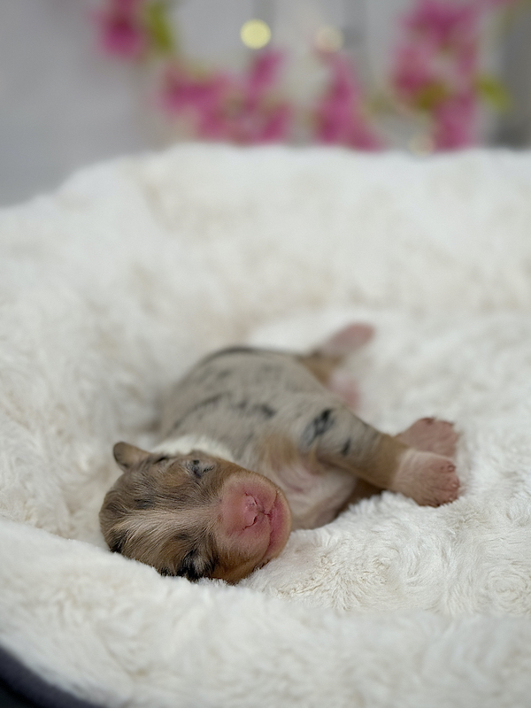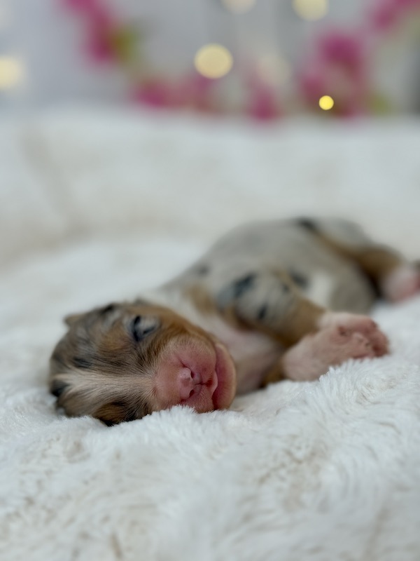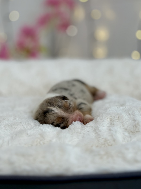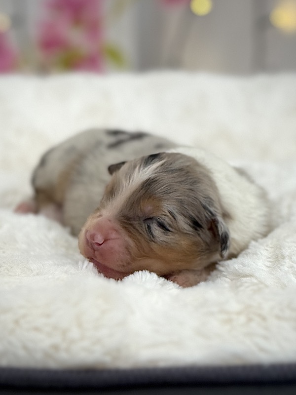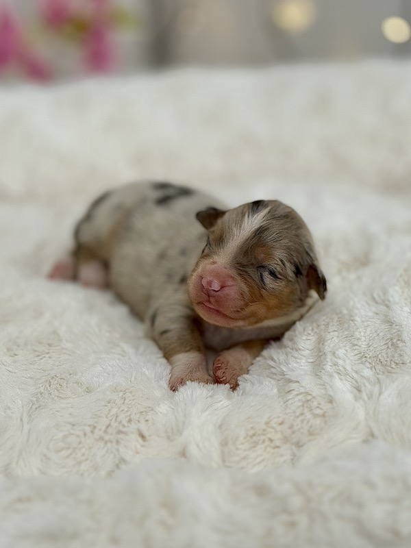 Una cucciola speciale – il suo meraviglioso mantello Blue Merle e il Natural Bobtail (NBT) la rendono davvero unica.