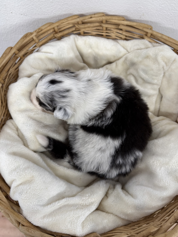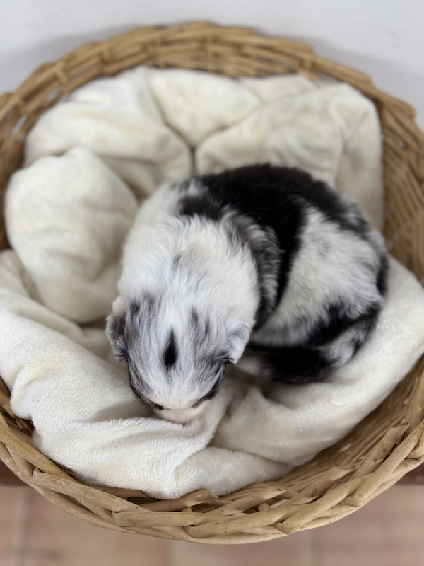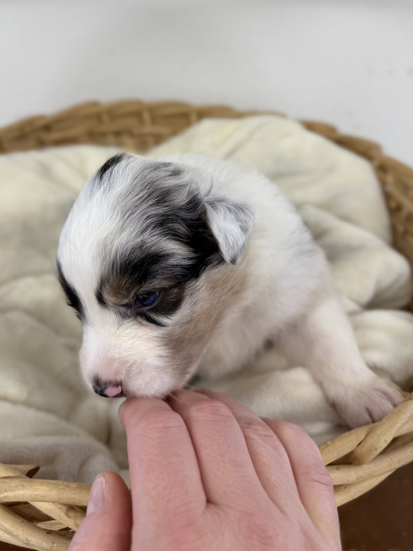 Si tratta di un cucciolo maschio di Australian Shepherd nel bellissimo colore Blue Merle con coda.