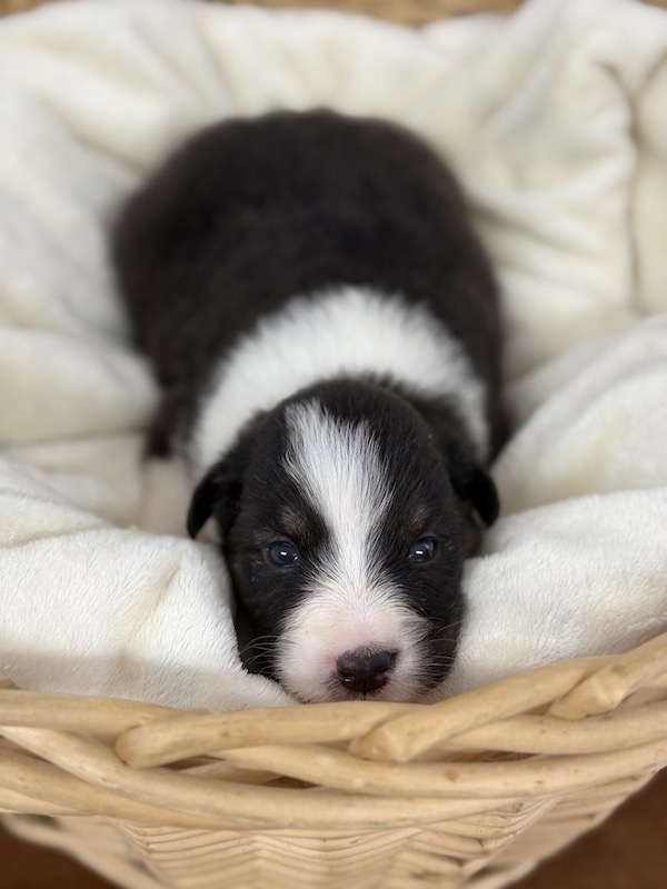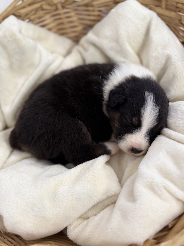 Si tratta di una cucciola femmina di Australian Shepherd nel colore classico Black Tricolor con Natural Bobtail (NBT).
